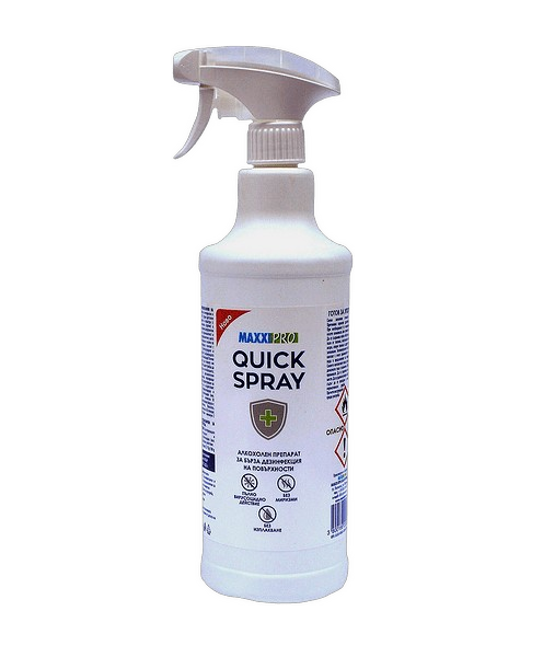 MAXXI PRO QUICK SPRAY е готов за употреба алкохолен препарат за дезинфекция на повърхности без изплакване. Предназначен е за дезинфекция на непорьозни и малки по площ, труднодостъпниповърхности, оборудване и апаратура, предмети и прибори в здравни и лечебни заведения, както и дезинфекция на непорьозни и малки по площ повърхности, влизащи в контакт с хранителни продукти. Притежава бактерицидно, микобактерицидно, фунгицидно и пълно вирусоцидно действие.