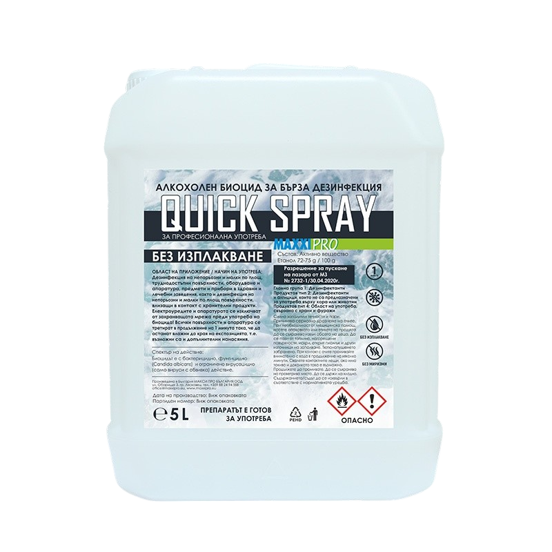 MAXXI PRO QUICK SPRAY е готов за употреба алкохолен препарат за дезинфекция на повърхности без изплакване. Предназначен е за дезинфекция на непорьозни и малки по площ, труднодостъпниповърхности, оборудване и апаратура, предмети и прибори в здравни и лечебни заведения, както и дезинфекция на непорьозни и малки по площ повърхности, влизащи в контакт с хранителни продукти. Притежава бактерицидно, микобактерицидно, фунгицидно и пълно вирусоцидно действие.